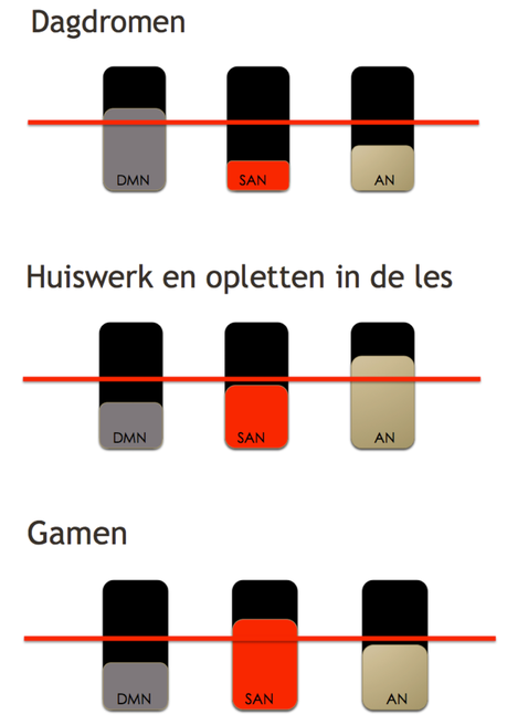 Bij zwaardere cognitieve taken wil je dat het DMN activiteiten staakt. Dat het Saliantie netwerk (SAN) niet zo sterk reageert op prikkels en dat het aandacht-netwerk aan gaat. Die stand willen op school voor leren, huiswerk en taken.